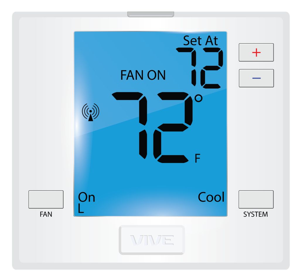 VIVE™ Wireless PTAC Non-Programmable Thermostat offers affordable comfort control, even when you are away from the source.Features:2 heat/1 cooling stage for heat pumps or 1 heat/1 cooling stage with conventional systemsHeating and Cooling Set point limitsSeparate B & O terminalsSeparate heating and cooling swing (cycle rate) adjustmentsRoom temperature calibration adjustmentsUniversal sub-baseMounts on wall or junction boxBattery or 24v power5 year warranty